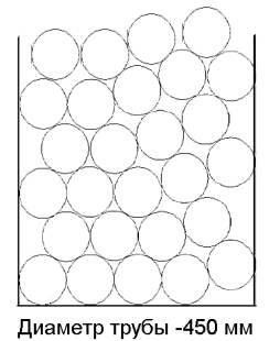 Труба Ø 450Количество труб: 27 шт. Количество, п.м.: 12 п.м. – 324 п.м.; 12,5 п.м. – 337,50 п.м.; 13 п.м. – 351 п.м. Высота загрузки: 2,65 м. Количество рядов: 6 шт. (в рядах по 5 шт.) |